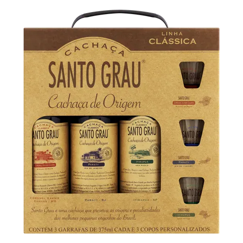 Kit 3 Cachaças Tradicional 375ml Cada + 3 Copos Personalizados Santo Grau
